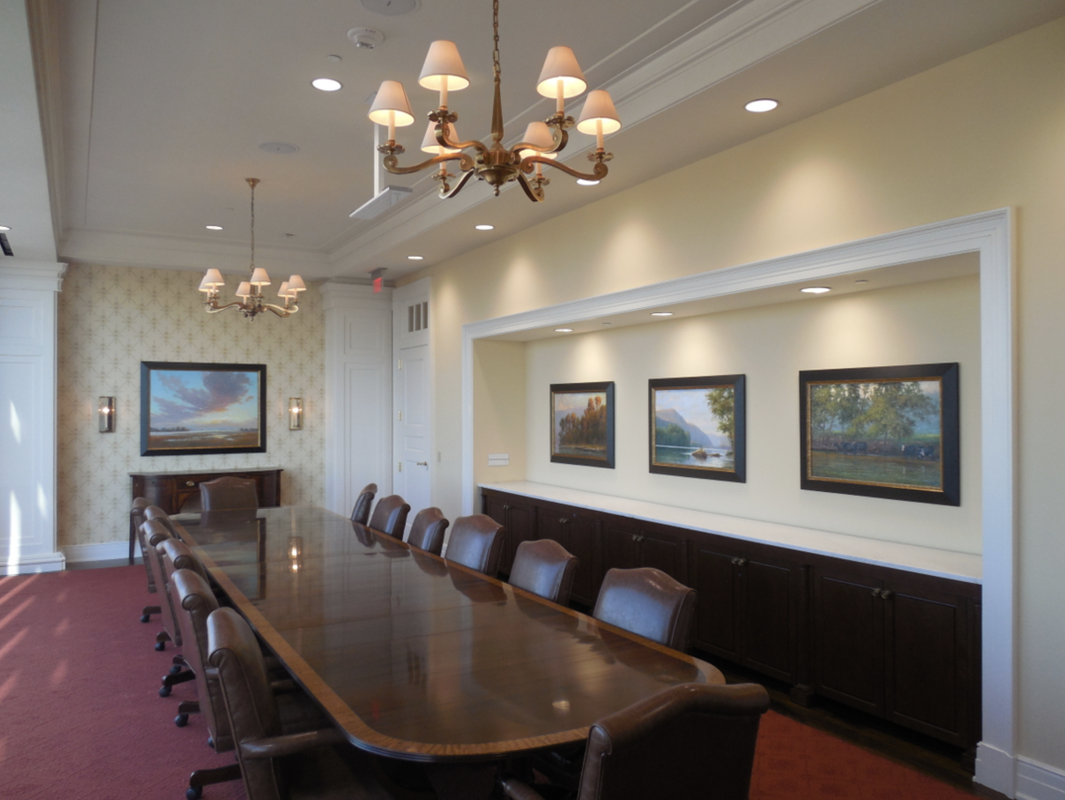 A beautifully appointed conference room in Richmond, Virginia, complete with original oil paintings by Ed Hatch and Sara Linda Poly, two phenomenal impressionist artists residing in Virginia. I worked on this project with The Anderson Art Group in 2016.